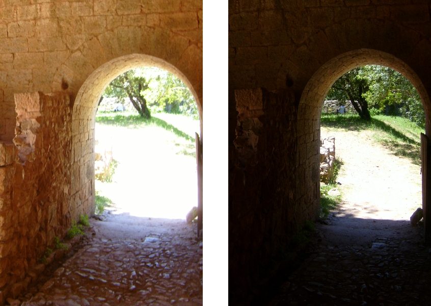 Die beiden linken Fotos sind mit einer herkömmlichen Digitalkamera gemacht. Links orientiert sich die Belichtung an den Lichtverhältnissen im Schatten neben dem Tor, rechts an den Lichtverhältnissen auf dem Weg in der Sonne. Dadurch ist jeweils ein Teil des Bildes über- bzw. unterbelichtet.